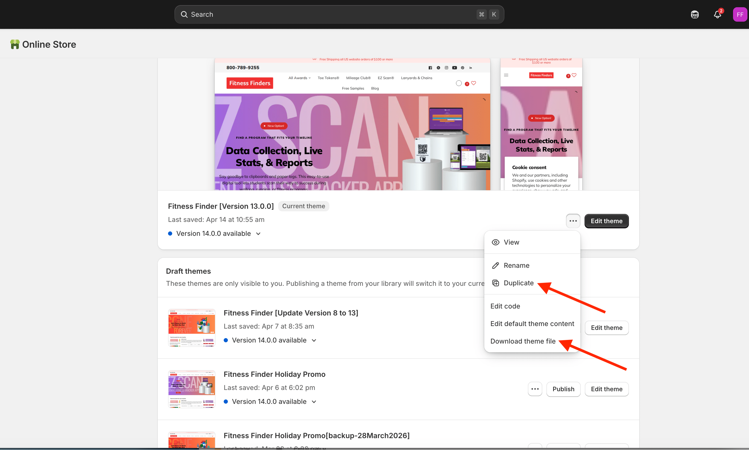 Then click Actions → Duplicate. Now you have a backup copy of your live theme sitting inside Shopify itself.