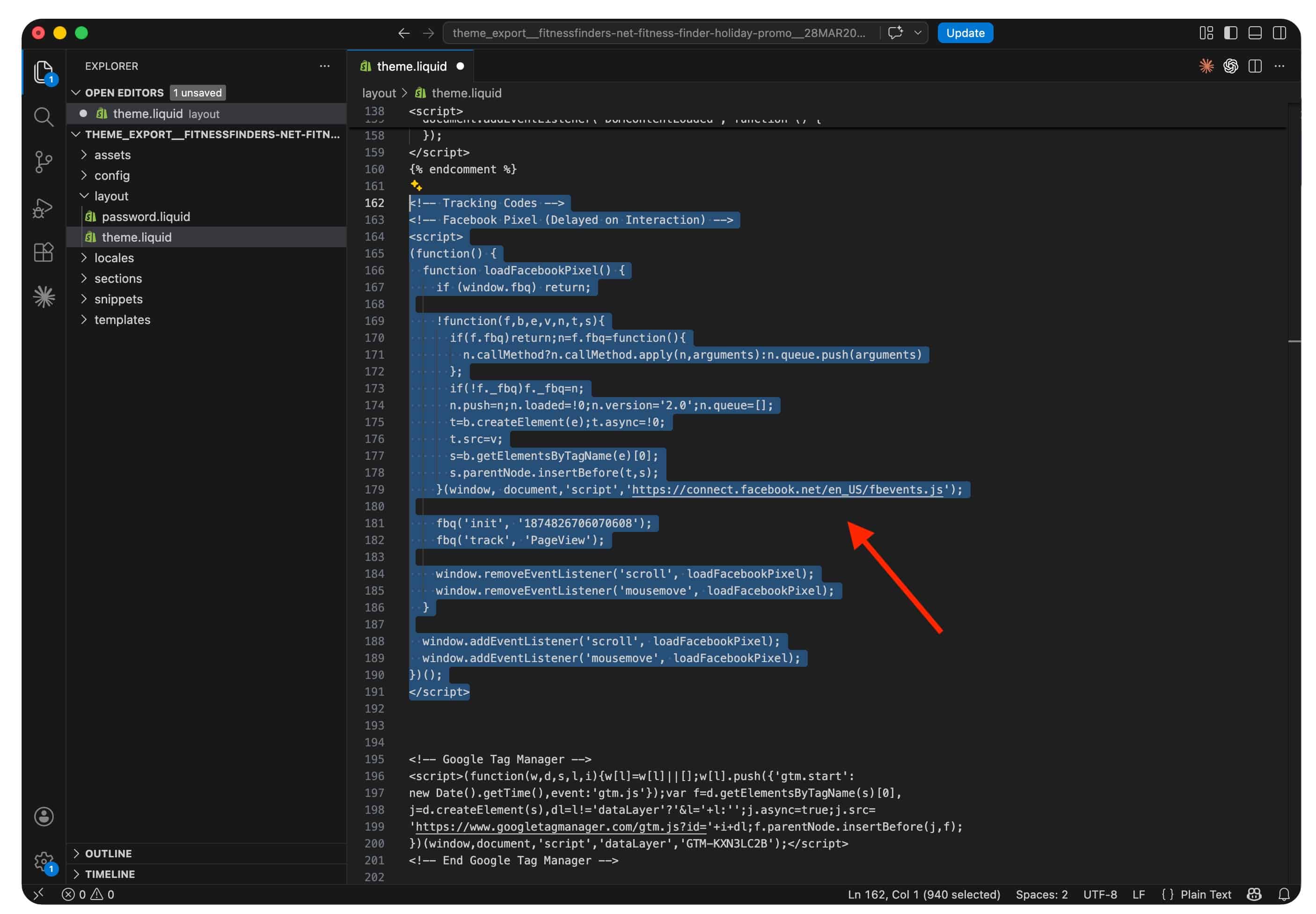 Keep a comment above each block — something like {% comment %} v8 CUSTOM: Facebook Pixel {% endcomment %}. When the next upgrade comes around, you will be grateful.