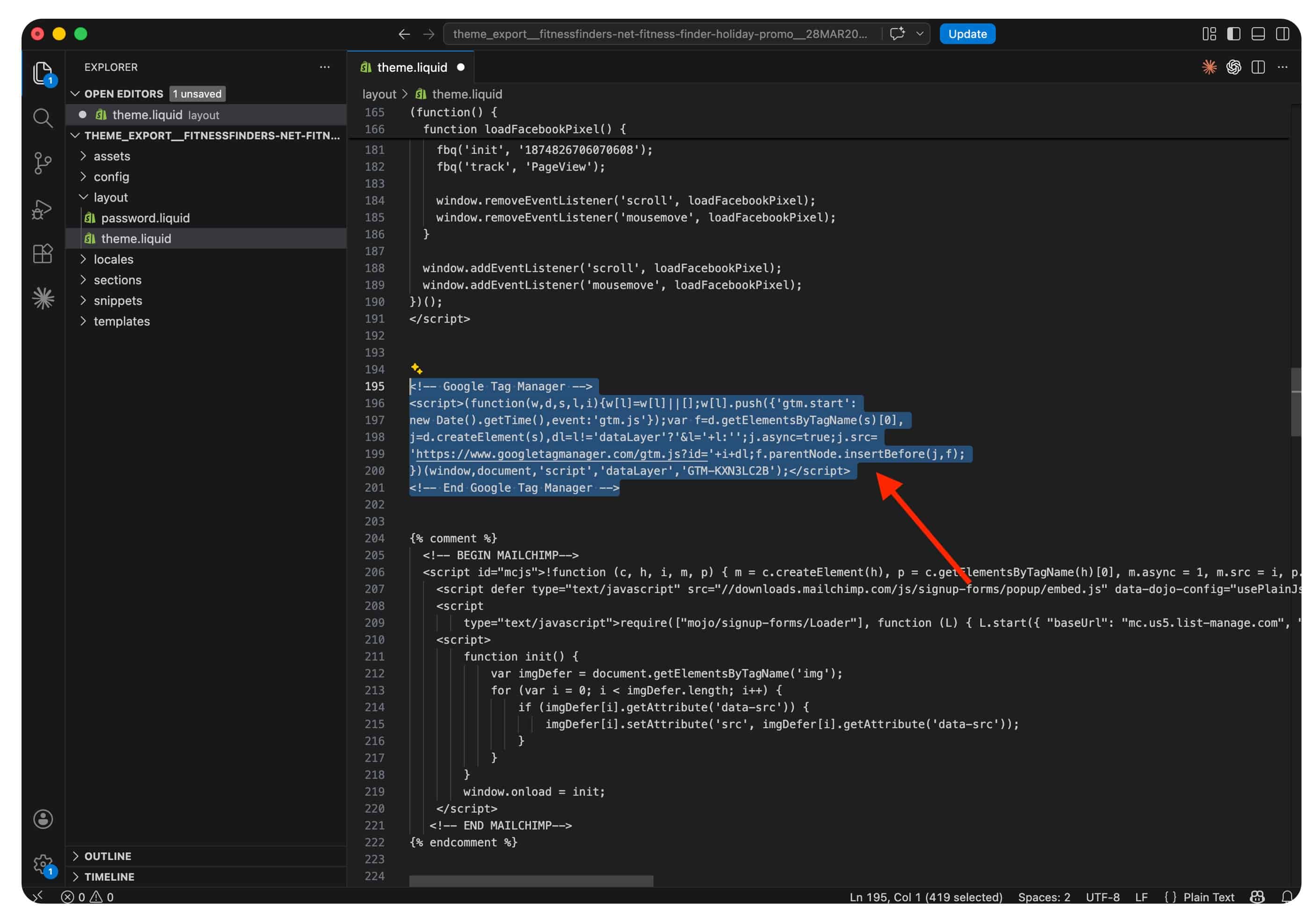 For theme.liquid, look for anything that looks like it came from a third-party tool. Analytics scripts, widget loaders, meta tags for site verifications, custom JavaScript blocks. Write them all down.