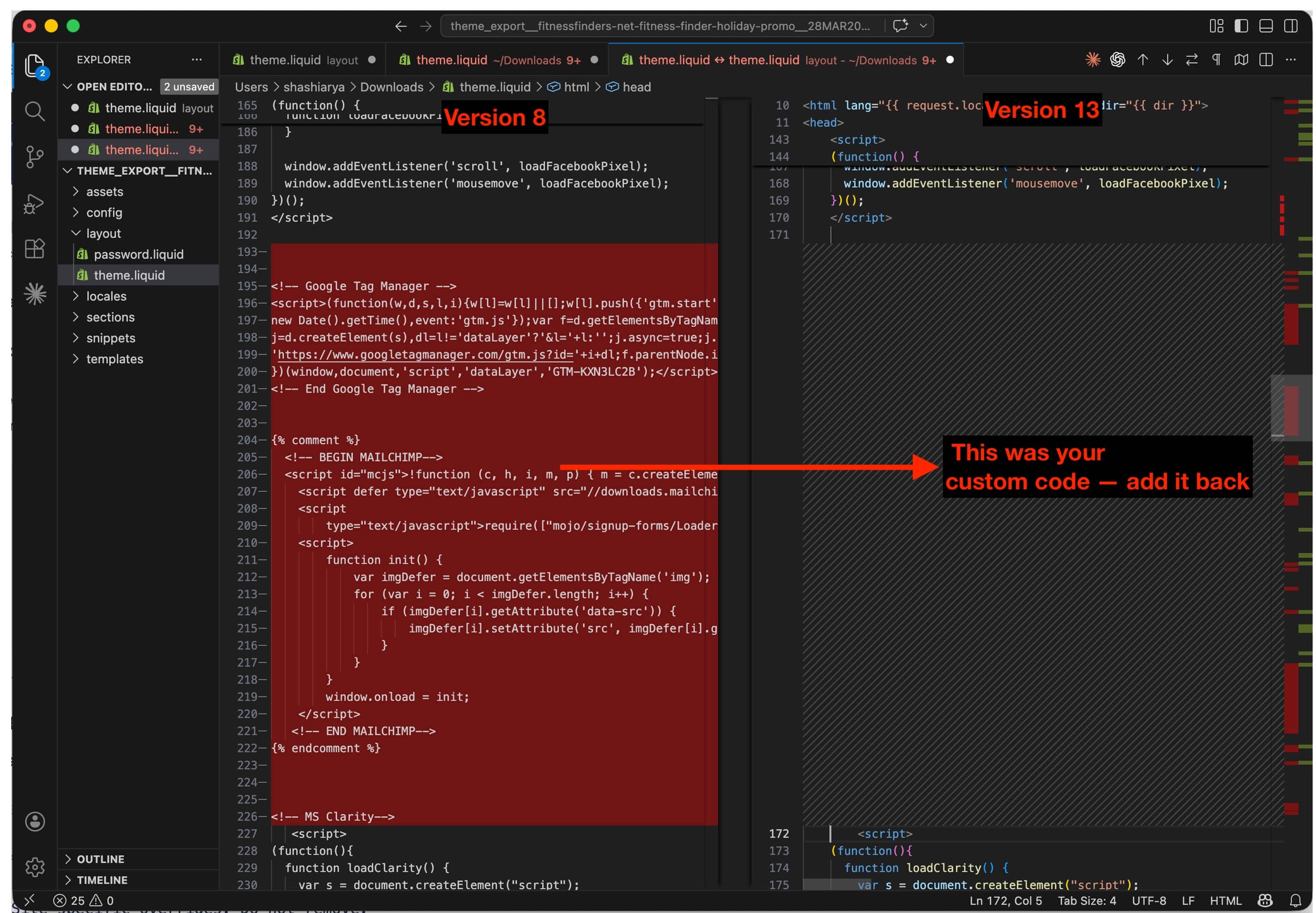 Open both versions of theme.liquid side by side in VS Code. Right-click the v8 file → Select for Compare. Right-click the v13 file → Compare with Selected.