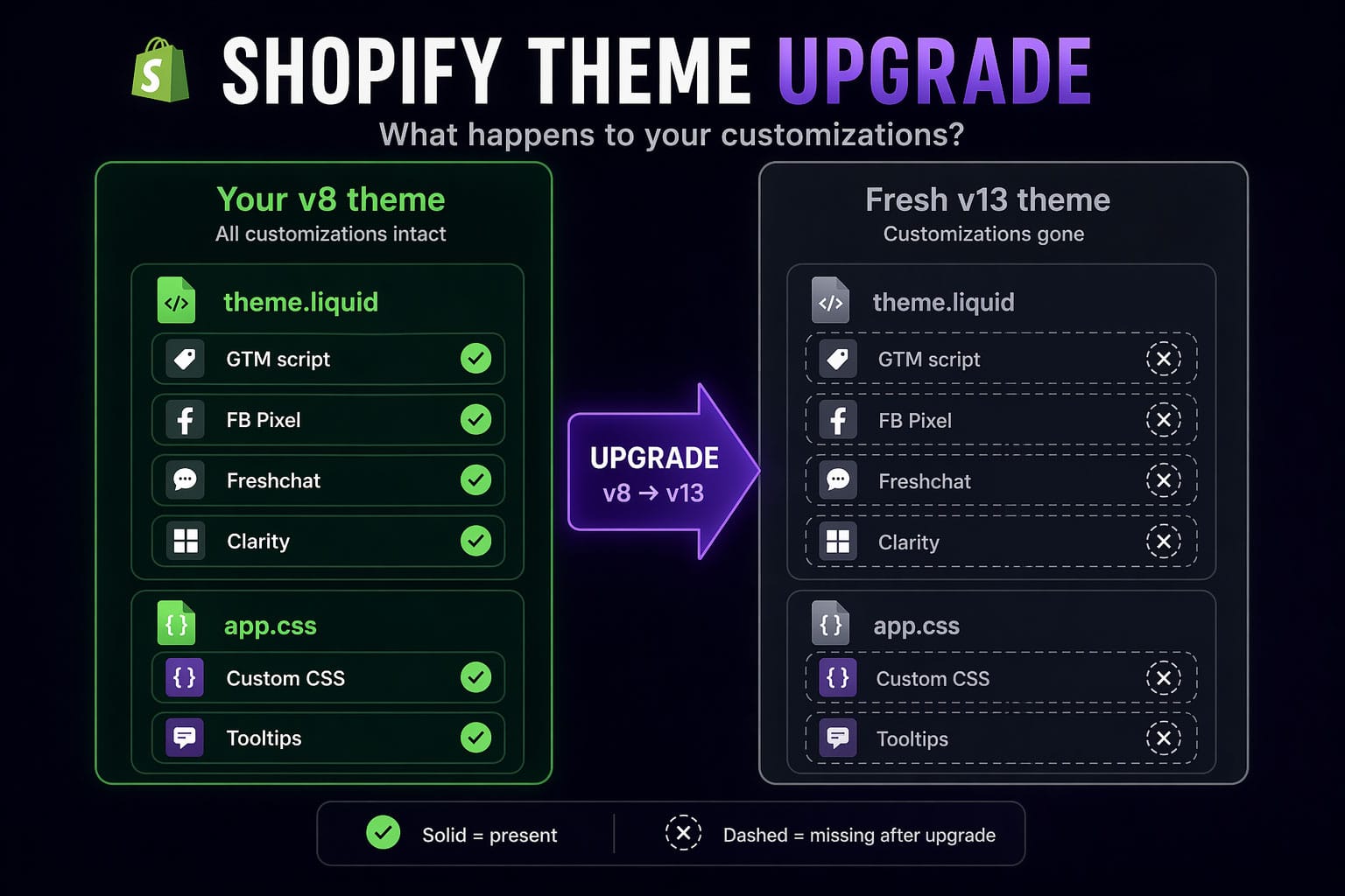 Your current theme has months or years of customizations baked into it. Tracking codes. Custom CSS. FontAwesome icons. Scripts that hide certain sections on certain pages. None of that is saved in Shopify’s settings panel. It lives in the files. And when you install the new version, those files get replaced.
